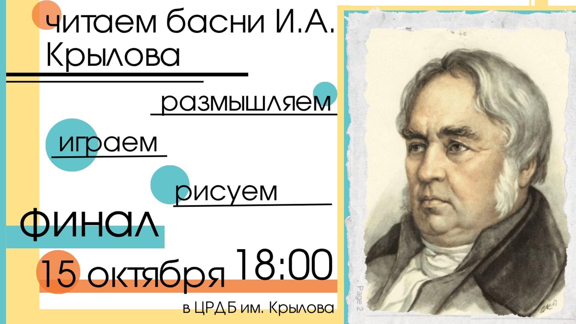 Финальный праздник акции и подведение итогов с вручением дипломов и призов состоится 15 октября в 18:00 в библиотеке им. И.А. Крылова.